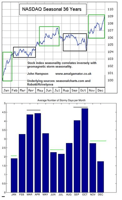 We can also see from the above chart that, based on forecasted geomagnetism, the trend is still up into mid-March. The threat to this is actual geomagnetism being greater than forecast, and at the time of writing an unforecasted geomagnetic storm is in progress. Below is a reminder of the historic seasonality of geomagnetism and its correlation with stock market seasonality, and it’s important to note that this is an average. In February 2012 so far we have not seen much of a pick up yet in geomagnetism, compared to seasonal history, but the threat is there that it begins to increase, putting pressure on the market, and as we move towards March, the threat becomes greater.