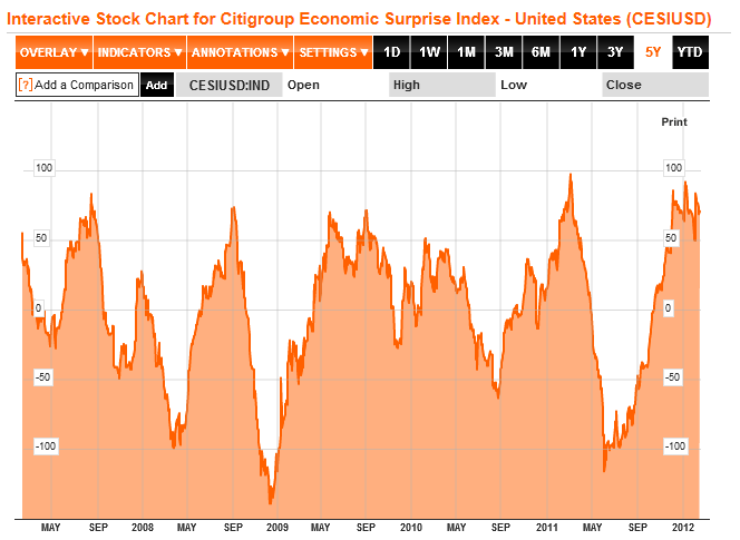 Here is a reminder of the market’s overall sideways action once Economic Surprises topped out and began to fall away gradually in 2009-10, following a similar surge up from an extreme low (that was a leading indicator for a market rally).