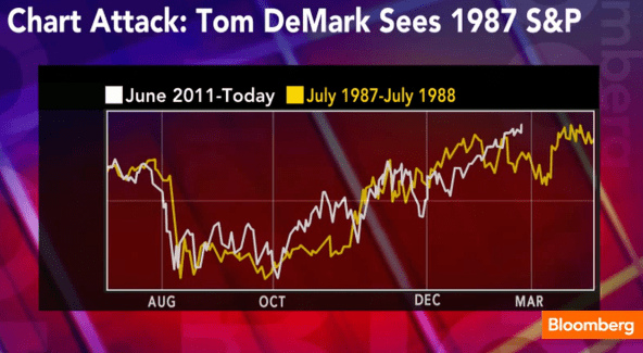 Tom De Mark pins us around a top here, still suggesting roughly a 5% retreat from here in total, in an up-down manner that frustrates bears, before the market then advances again. He makes the following analogy with 1987: