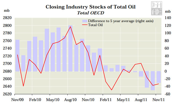 This is total OECD fallback stocks. Note that the dip in these stocks early in 2011 corresponded to the oil price accelerating in that period, only for the Euro-debt deflationary episode to deflate it for a while. But now stocks are decreasing again and the crude oil price is back over $100.