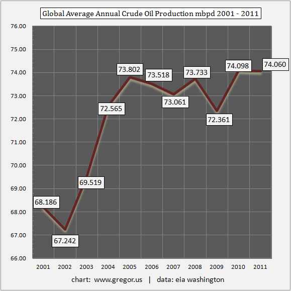 But now look at global production – it has been flat the last few years, with new supply coming on stream only covering old supply ending. Although it appears from the above chart that oil supply has been rising along with demand, it partly reflects drawdown on emergency stocks.