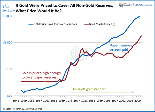 If all non-gold reserves were covered by gold then the price would be close to $10,000. As can be seen, during the last secular stocks bull of the 90s, the gap in this measure didn’t inspire it to close. Whether it could do now, in a secular gold finale, remains to be seen.