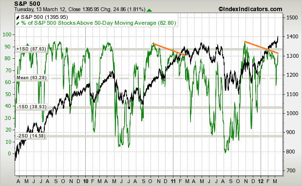 There is a potential divergence in % stocks above 50MA that could spell a period of sideways range action after that.