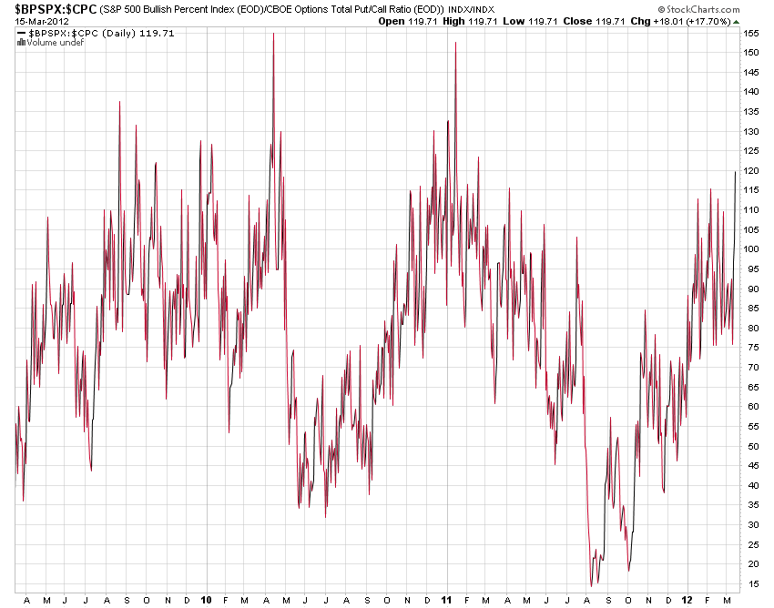 We see a partial set of overbought and overbullish indicators in stocks. Ideally a push a little higher into next week would give us a more complete set and make for a more compelling turn in the turn window. Here is bullish percent over call/put – into the excessive zone again: