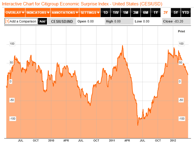 On the macro front, a persistent dropping in Economic Surprises (echoing last year) makes it likely the stock market rally will soon pause or end, if it hasn’t already begun that process. However, we still don’t see a general set of extreme overbought/overbullish indicators in equities. If stocks continue to go up and surprises continue to decline, then a short will become more attractive, but I would be looking to other factors in assessing how attractive.