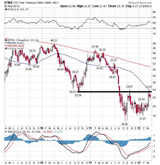 A look at treasury yields and the dollar reveals a delicate position in both. 10 year yields completed their obvious move up to the s/r line shown, and now the question is whether they can penetrate and rise above that line, or whether that was just a counter trend rally. The Fed’s actions and words may have some influence in this, and the next FOMC is April 24/25.