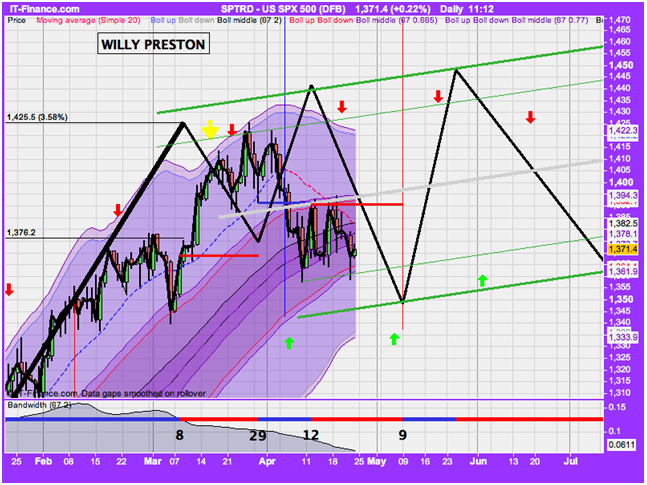 I take your point as it does look like it has done so recently. The target of the up drive from 23rd Nov was 1425. On the 8th March. The top was 1425 so I think that that stands up. The gradient of the rising channel seems to be accurate so far as can be seen by the fact that it has bounced off the projected 1sd. I think it will be most interesting to re evaluate on the 9th May – at the next modeled inflection point.