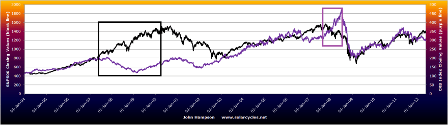 The reasoning behind secular asset peaks merging with solar peaks is that sunspots drive human exciteability which translates as speculation, buying and inflation in the markets and economy. Sunspots have been a little underwhelming in Q1 2012, but just lately picked up. If sunspots start to make new highs, then I expect commodities to begin their outperformance. But putting sunspots aside, let’s recall what happened in late 2007 and early 2008 when commodities went the opposite way to stocks.