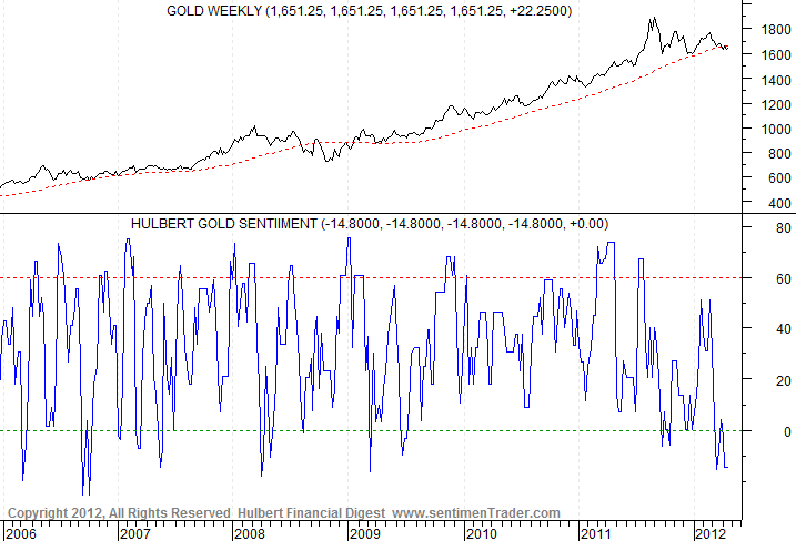 Right now, certain commodities display contrarian oversold and overbearish readings. That makes for a fairly compelling buy if I am correct about outperformance and mania ahead in 2012/2013. Gold should be the leading commodity in this Kondratieff Winter, and it is one commodity showing excess pessimism, with gold miners likewise.