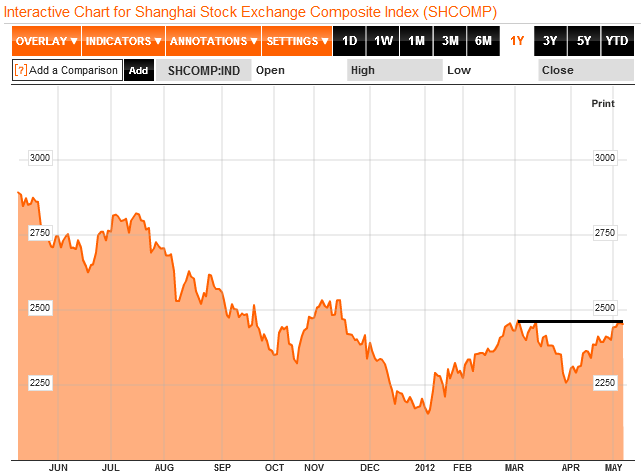 The Chinese stock index needed to make a higher high to confirm a new bull trend since the start of 2012 but has pulled back at a double top, shown. If it can break out, it will be suggestive of China growth and associations with commodities.