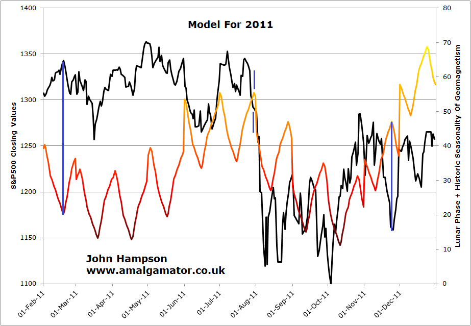 Again, this is just a hypothesis that maybe they are significant. But the rest of 2011, the market fairly well tracked the lunar phase oscillation as we would expect.