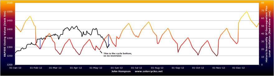 In 2012 we already saw one occur in February, which perhaps marked the end of the up-move out of 2011, as oil and gold topped in February and indices as a whole started to track overall sideways. Then this last weekend’s inversion could spell the end of the sideways consolidation or the end of the correction. The seasonality of geomagnetism would support the market beginning to rally again here. As would the secular position, posted yesterday. As would the major washout readings in sentiment, CBI and oversold indicators. If you are of a different persuasion, it could mark the end of overall sideways correction and the beginning of massive falls.