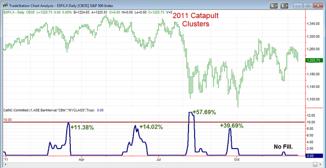Capitulative Breadth (Rob Hanna’s CBI) hit on Thursday and Friday of last week. In the chart below for 2011 the lower blue line shows where this happened last year. The first occasion was in March, which produced a kind of V-bounce in stocks. The second was in June, where a more rounded bottom was reqired with some volatility around the basing, and the third was the Sept-Oct much longer, messier bottoming. That Sept-Oct period was a double bottoming, however, and buying the first CBI did lead to a v-bounce, only shorter lived.
