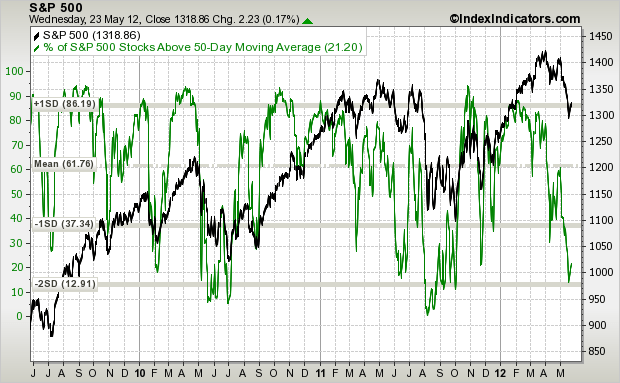 Percentage of stocks above the 50MA shows how extreme oversold we just reached, but again from that kind of level we have previously seen v-bounces or more extended basing, lasting from a couple of weeks to a couple of months.