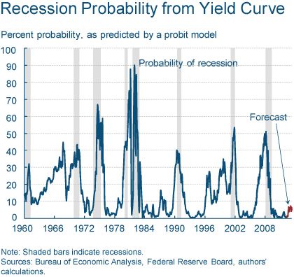 2. Yield curve / spread (if abnormal or inverted, may signal bear/recession ahead) – currently flattening but normal. Yield curve suggest negligible probability of recession.