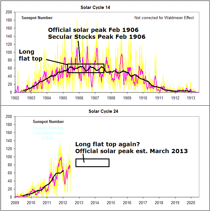 So how did that affect the secular asset cycle back in the early 1900s? As you can see from my notation, the secular peak (which was in stocks) occurred on the nose of the official solar peak, which was near the front end of the flat top. So, if SIDC and NASA are correct in their predictions for a Feb/Mar 2013 official solar peak, then we might expect the secular peak (in commodities) to occur close to that, rather than towards the end of the flat top, if such a top extends out into 2014.