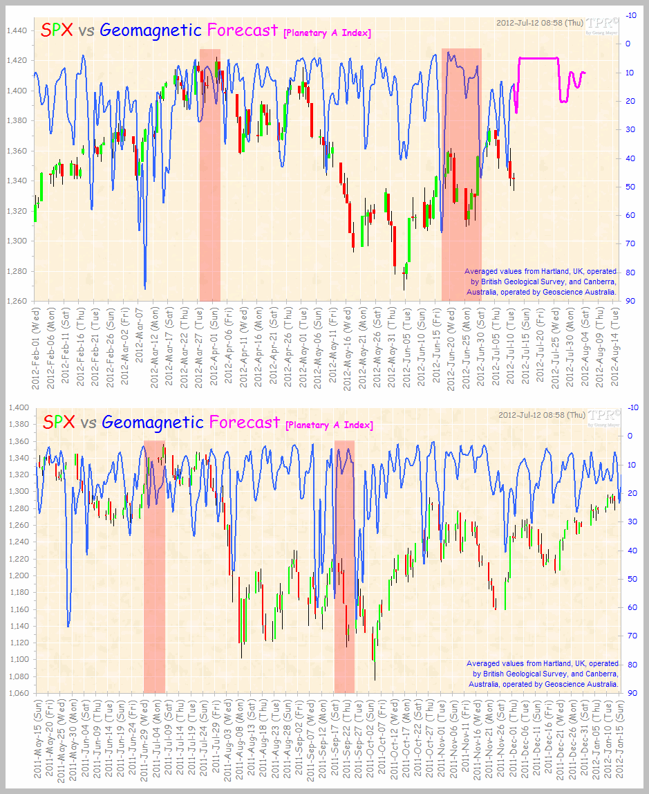 There is the potential within that for a little upside into the end of next week, the 20th July, around the new moon, before we experience a bearish combination of a significant period of geomagnetism and a full moon around the turn of the month into August – which coincides with the FOMC. Disappointment out of the FOMC is the potential therefore.