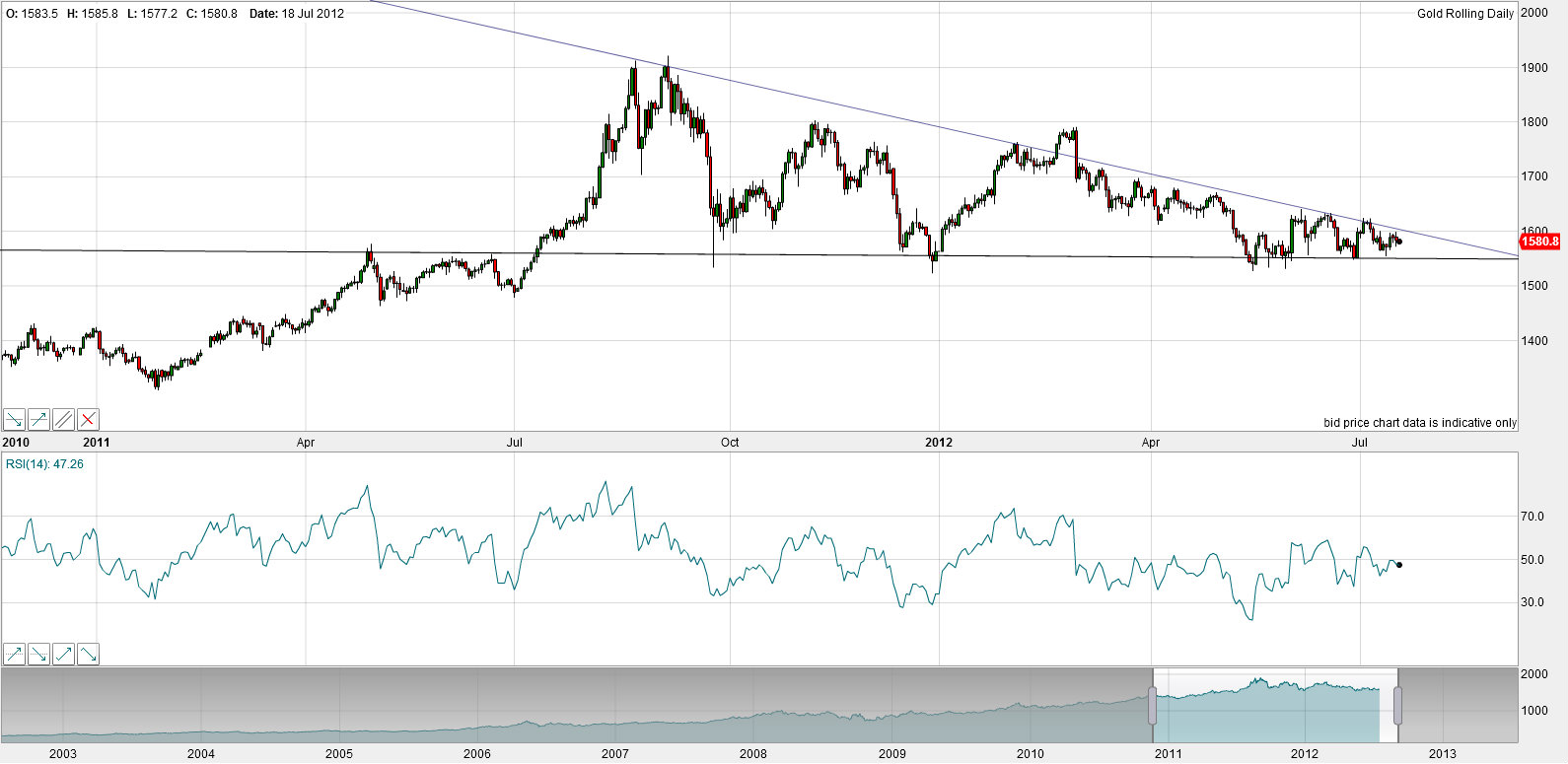 Bernanke’s testimony yesterday decreased the likelihood of QE3. Whilst that may be a short term disappointment for gold, it doesn’t need it, due to global maintenance of negative real interest rates. Nevertheless, gold remains devoid of momentum and languishing bearish. What will trigger the triangle break? If nothing else, time is close to running out.
