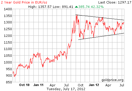 Priced in Euros, the triangle is more bullish and gold is threatening the upper boundary: