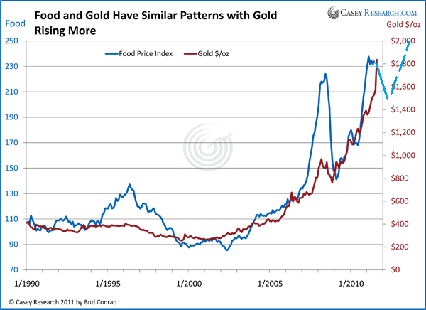 I reproduce below Casey’s chart showing the close relationship between food prices and gold. Since this chart was published, gold has made its 9 month triangle with a base at $1550, whilst food prices pulled back to 200 – again a similar move for the two. But based on the acceleration in soft commodity prices in the last few weeks, the food price index is predicted to make new highs in H2 2012, which should imply gold also makes new highs.