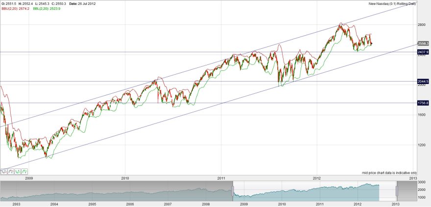 This is the technical picture for the Nasdaq, the leading index. In a very tidy channel since the bull market began in 2009, it has made a series of advances and consolidations. I have marked the horizontal supports for the consolidations – in each instance the market retreated to the previous bull market high and successfully backtested it without dropping below it. This has happened again in 2012, with the market holding above the 2011 highs. In short, the bull market is very much in tact from a technical perspective. The Nasdaq is currently at the bottom of its bollinger bands, suggestive of an up-move ahead, however there is scope for the overall consolidation to be extended deeper into 2012 without compromising either channel or horizontal support.