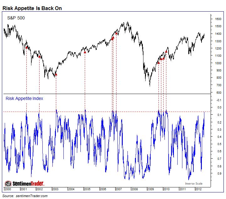 Those developments give more confidence that commodities did not already make their secular peak and that other equity indices could break out. However, it’s tentative for now as these new highs are marginal and until other pro-risk follows suit. Furthermore, we continue to see opposing indicators that present a confused picture. Here are four indicators from Sentimentrader.