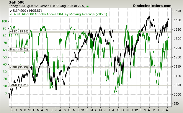 Back from hols and it was a good week for pro-risk and my account. Can pro-risk go further? I maintain that it can. By solar and secular cycles, we should see a blow-off top in pro-risk, with stocks overthrowing (H2 2012) and then wilting (end of 2012 / start of 2013) whilst commodities make a parabolic secular finale (into the solar peak of Spring 2013 and terminating around summer 2013). So do the technicals, indicators and macro data support this?