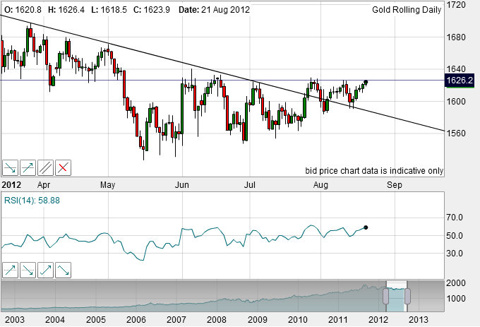 Getting technical again, US stock indices do not yet show overbought or overbullish readings. Were they to reach those levels, I would be much keener to offload some longs and take profits. The Euro is also showing signs of solidifying its base above 1.2 versus the US dollar. Gold is similarly building up its base and as can be seen below could be close to a break out of horizontal resistance, having successfully broken and backtested falling resistance.
