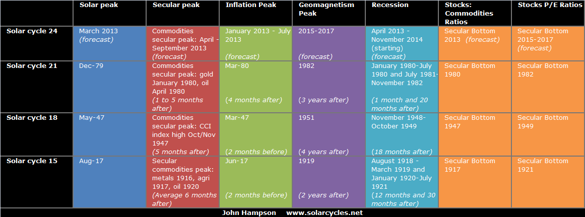 For the ‘purest’ solar-secular peak, commodities and inflation would peak close to the solar maximum, projected to be March 2013. The economy should tip into a recession following that. Working backwards, stocks could therefore start to turn down as of October 2012, whilst commodities make their parabolic move. Commodities should begin to truly accelerate as of 6 months before the peak – roughly Sept 2012 – and make their mania move as of 6 weeks before the peak. However, note this is only an idealised timeline – the table above provides the reality. Still, it gives us a guide. If stocks can break up to new highs soon, then I am looking for an overthrow move to extremes of overbought and overbullish together with negative divergences and a topping process (a messy up and down range period) into this Autumn/Fall to provide a suitable coming together of timing and technical indicators to exit equity longs. Whilst that occurs, commodities should take over as the outpeforming class.