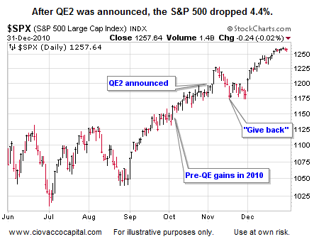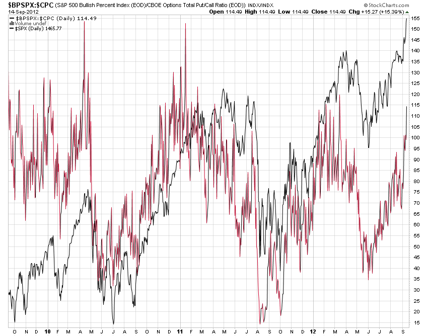 6. Euro-USD pulled back having reached overbought/overbullish, and could pull back a little further to rising resistance. The key question is whether it has made a medium term trend change given the renewed confidence in Euroland and the dollar-debasing US QE-without-end. We know that QE1 and QE2 announcements made for enduring rallies into pro-risk (after the initial spike and correction couple of weeks), which would suggest Euro-dollar, commodities and equities all rallying. There are no guarantees third time round, but market participants may lean more pro-risk, aware of that history.