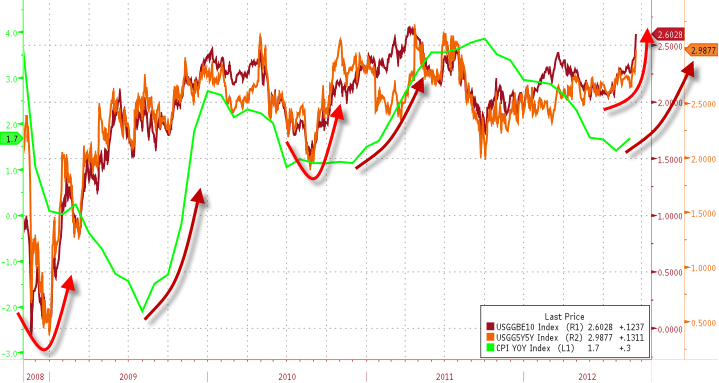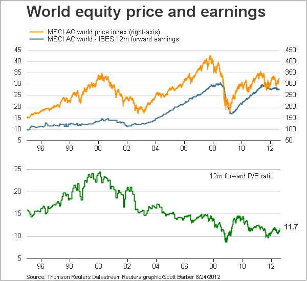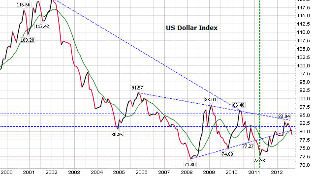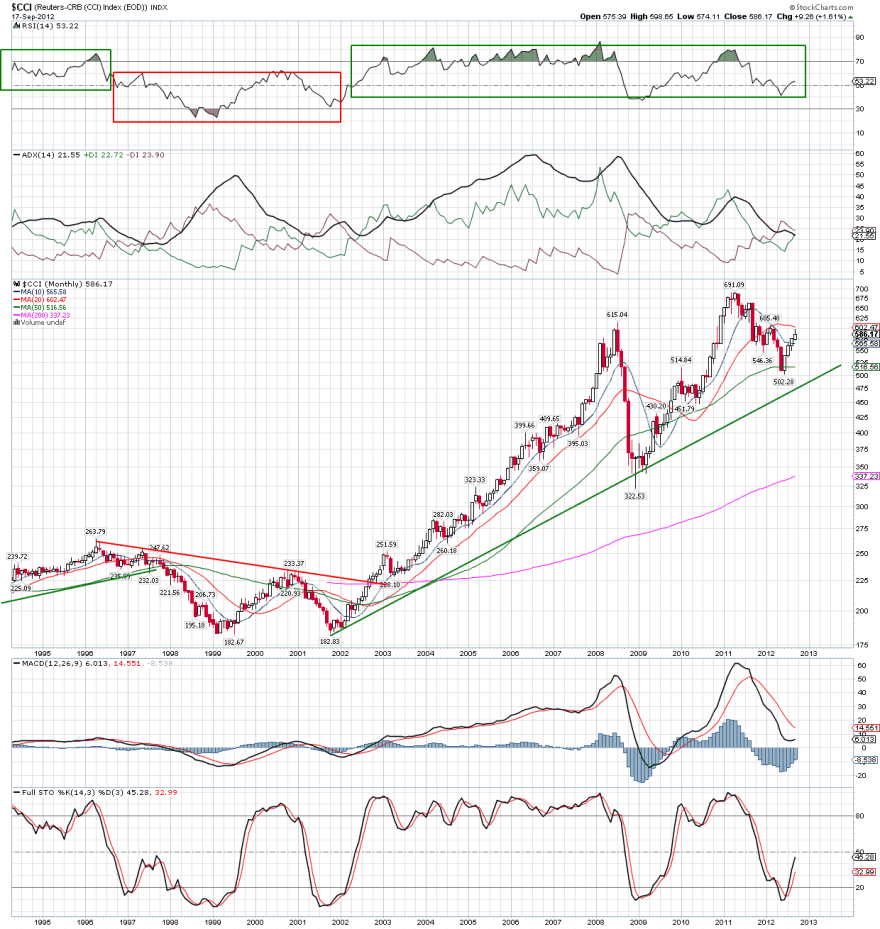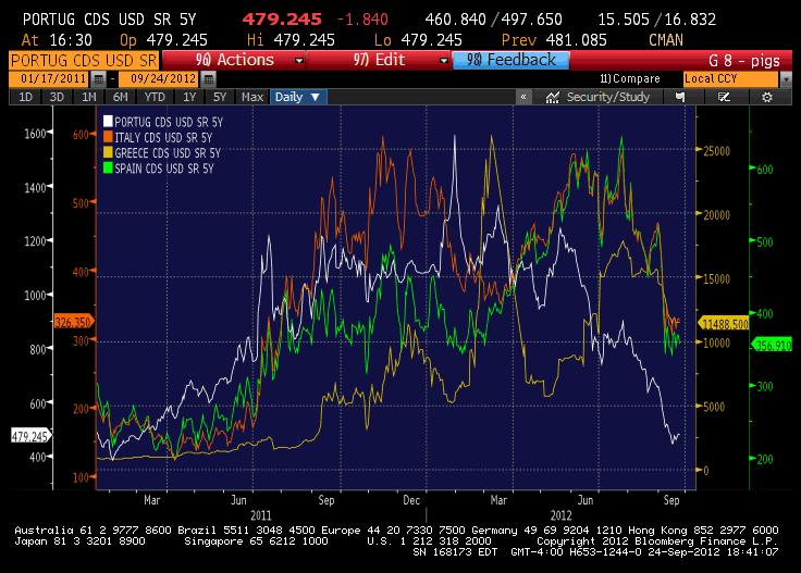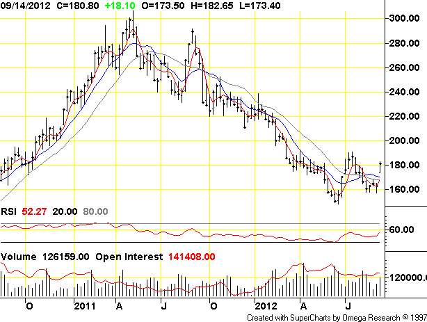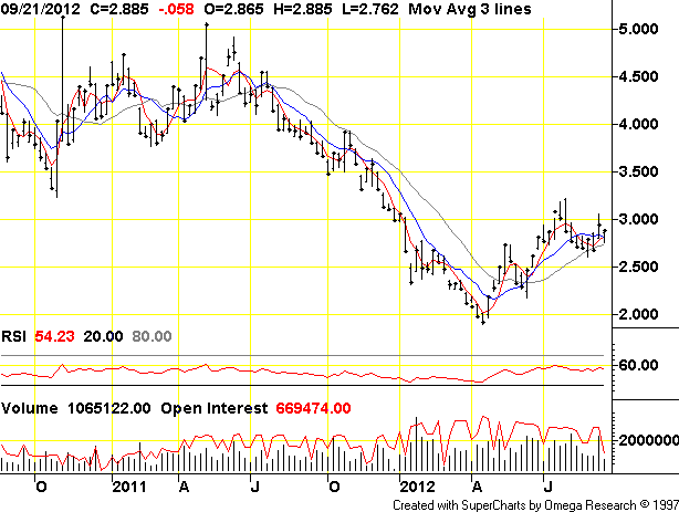 8. Natural Gas has been the stealth hit of 2012. Below is a weekly chart as of the end of last week and this week it has risen to 3.3. If you bought at the bottom in April, you would be up 75%. Well, my story is this: I was one to buy in long in 2010 and 2011 as it dipped several times below 4 (at what appeared excellent historic value and historic extreme cheapness versus oil), only to see dire performance continue and even worsen. Hence my aggregate position is still underwater but as the excess gas inventories have been declining it looks like it may eventually turn a profit. I consider this asset to really have been a good example of ‘the market can stay irrational longer than you can stay solvent’. My exposure was never that significant in my account, but it has taken a lot of patience to see a turnaround.