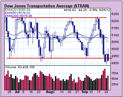 4. The Dow Transports continue to languish, but a little indecision at the bottom of the range could spell another reversal back into the range. It’s an important one to continue to watch.