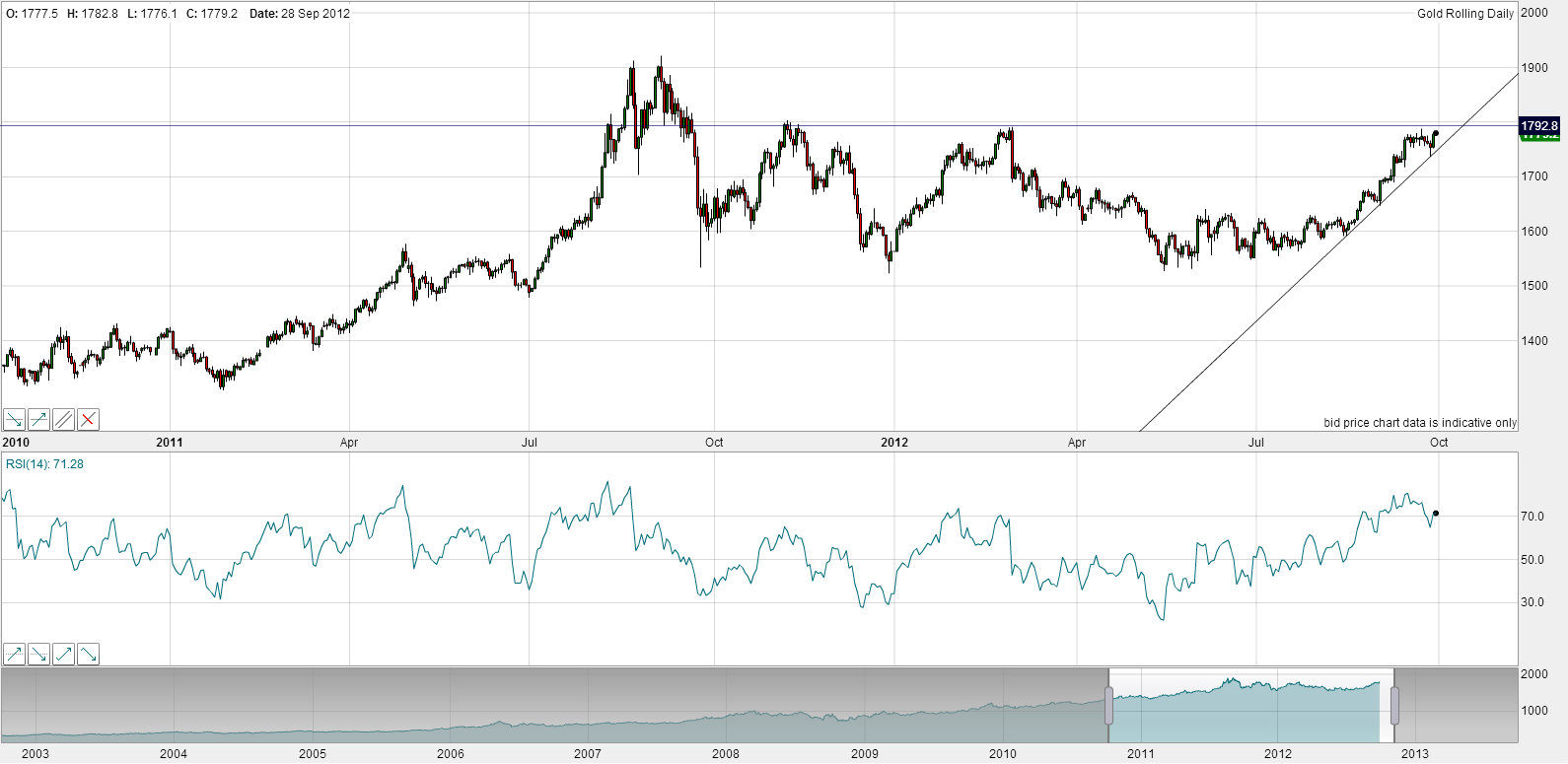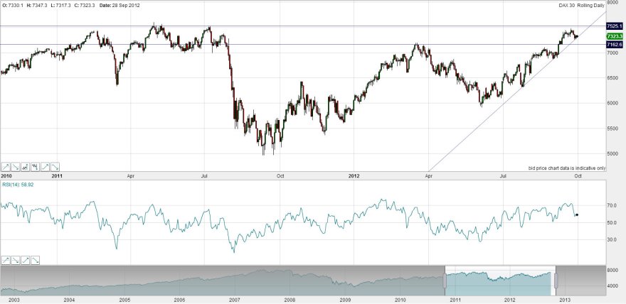 2. The German Dax bounced yesterday at rising support. The technical situation is shown below – for my bullish case, the most important is to hold above the March 2012 highs – a previous resistance that should now be support. If the Dax can hold that rising support line then the next target is the cyclical bull highs to date of mid-2011.