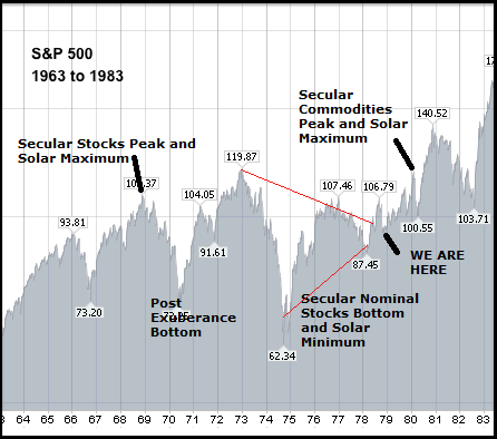 Based on this new September (approx) 2013 solar peak, here are the US stock index charts again showing our current secular position based on historical repetition, updated. The first shows the SP500 in the 1970s secular bull. Stocks rallied from here into the solar peak, i.e. for another 12 months, but with a lot of back and forth, and then stocks fell right after the solar peak, as high commodity prices helped bring on a recession.