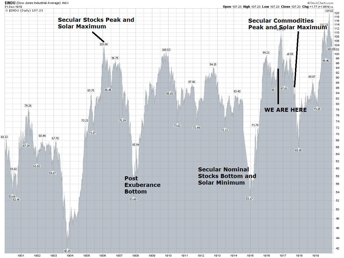 And below we see the 1910s secular commodities bull period. Stocks rallies from here for a couple of months and then fell back again, falling around the solar peak, as commodities peaked at different times.