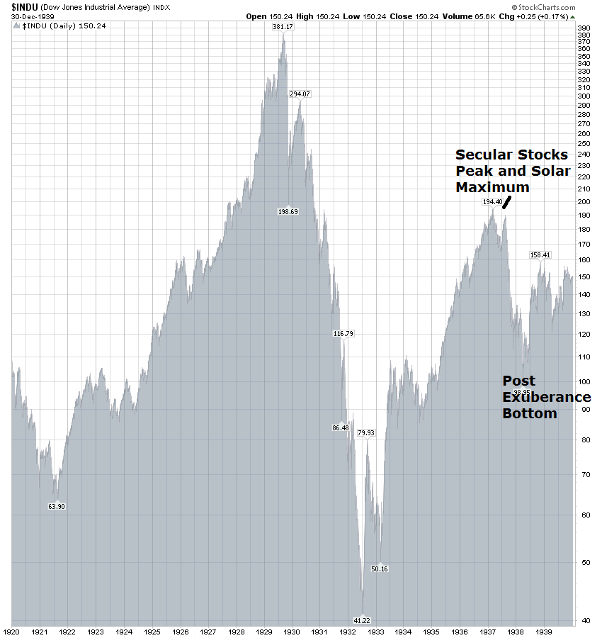 Next we see the 1940s secular commodities bull period and the Dow Jones. Apologies but it is split across two charts. From the current point, stocks would be peaking, making a swift 20%+ fall, and then tracking sideways into the solar peak, and thereafter taking some time to pick up momentum. I believe the 1940s is the closest mirror of our current secular commodities bull, due to the shared ultra low interest rates environment.