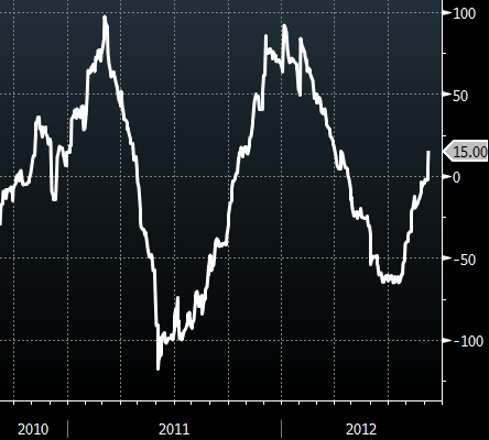 That perhaps reflects an improving US economy, as evidenced by ECRI leading indicators and Citigroup economic surprises both moving into the positive: