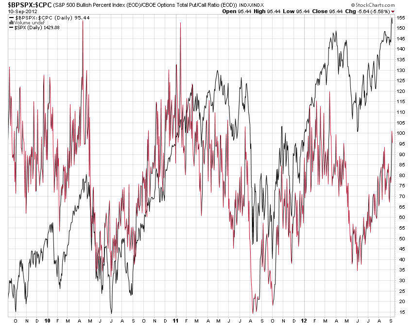 Looking at sentiment, bullish percent over put/call ratio has a little room to move higher, compared to previous peaks, and to oscillate in that kind of region for longer.