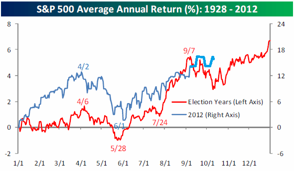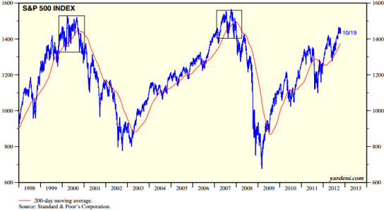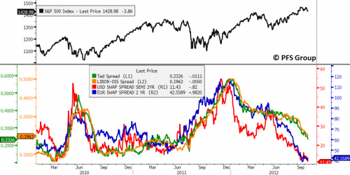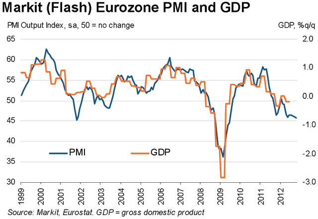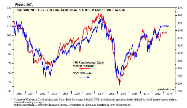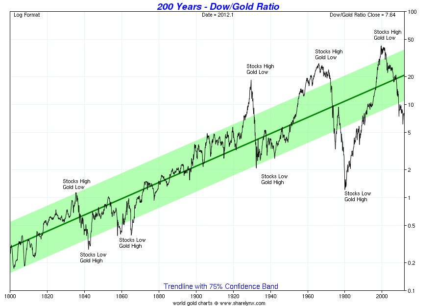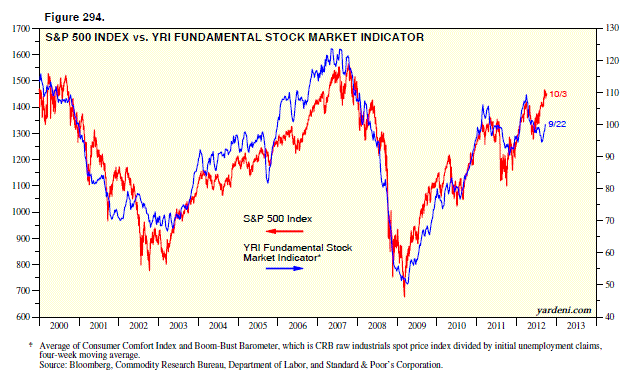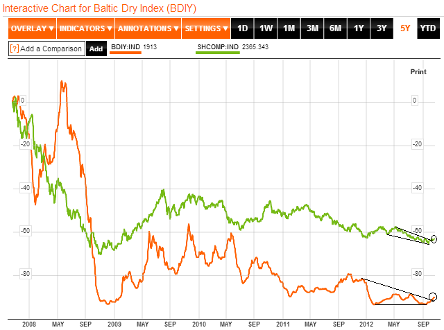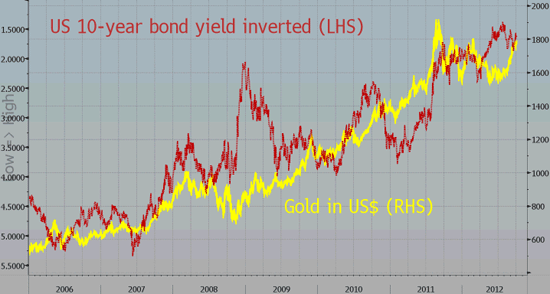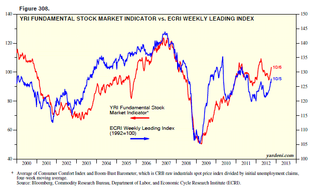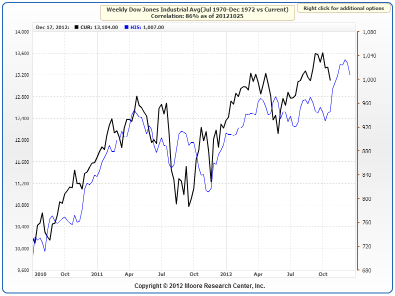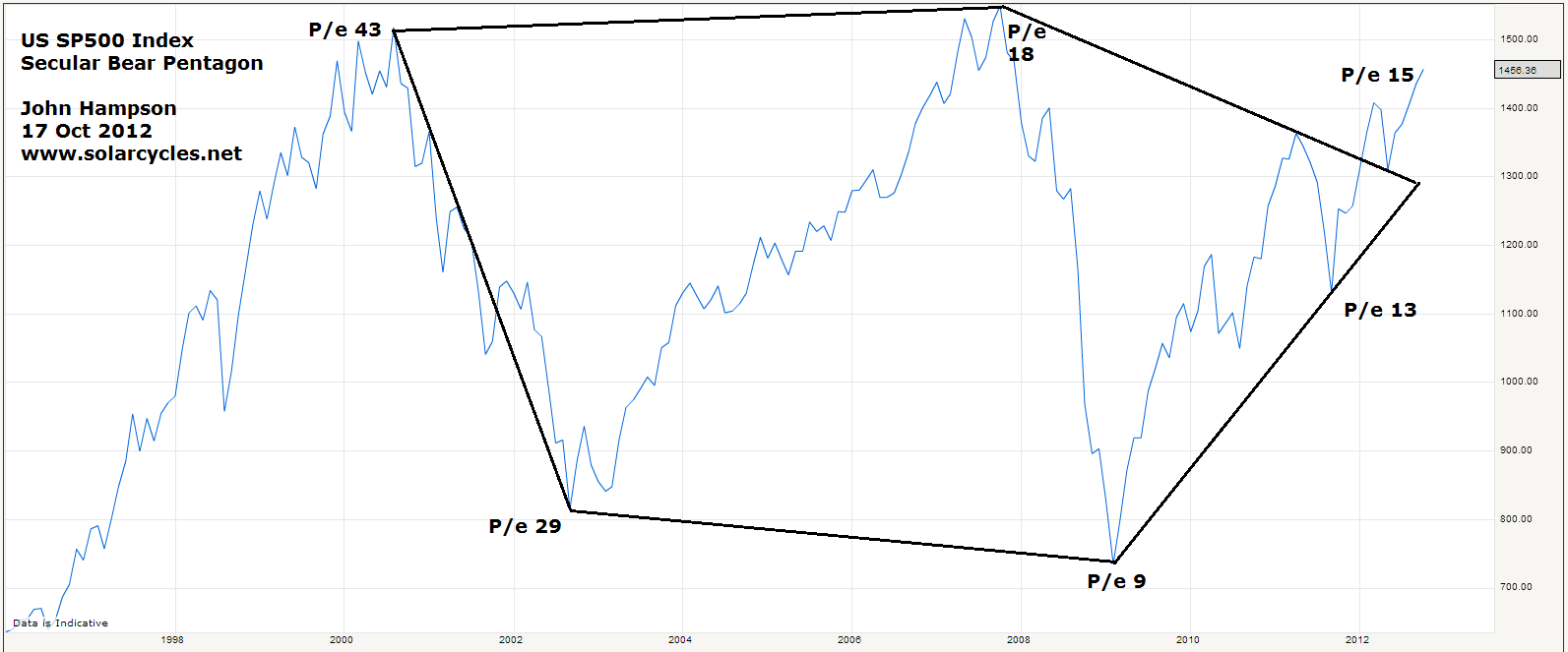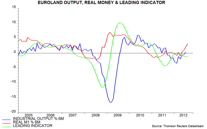 Below is my recent prediction for stocks and commodities into 2013. Now if stocks top out lower than 1600 on the SP500 and have begun their topping process already then that is still consistent with historic mirrors (only the peak price level would change), as long as commodities now go on to outperform and make their blow off secular top. The rise in treasury yields despite the pull back in pro-risk is a positive for this scenario because by history yields need to rise as money flows out of safe havens into pro-risk, and if equities are stalling then commodities should be the recipient. The current threat to this scenario is the renewed weakness in global data (leading / concurrent). I maintain there needs to be sufficient health in the global economy into 2013 to enable a broad secular commodities blow-off top. Gold could potentially go its own way – operating as a hard currency and safety asset – but right now it isn’t showing any outperformance. And one last thought – if a renewed global turndown did gather pace right ahead, then might the Fed step in once again, this time with one of its as-yet-unused unorthodox policy tools, which could then inspire a mania into hard assets if desperation was perceived? It may not work again but could provide a tipping point into hard assets.
