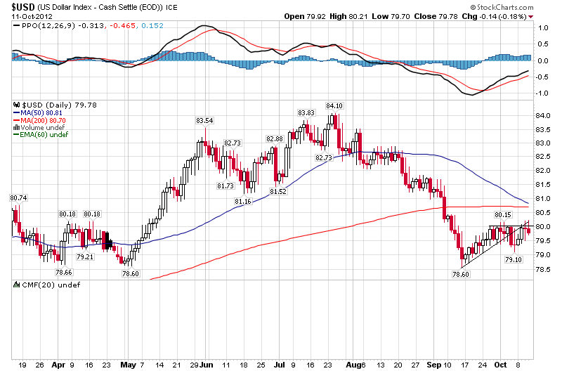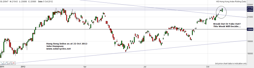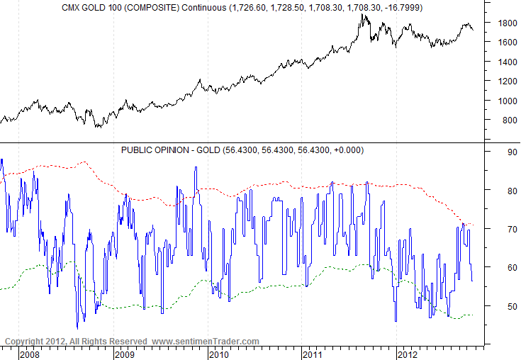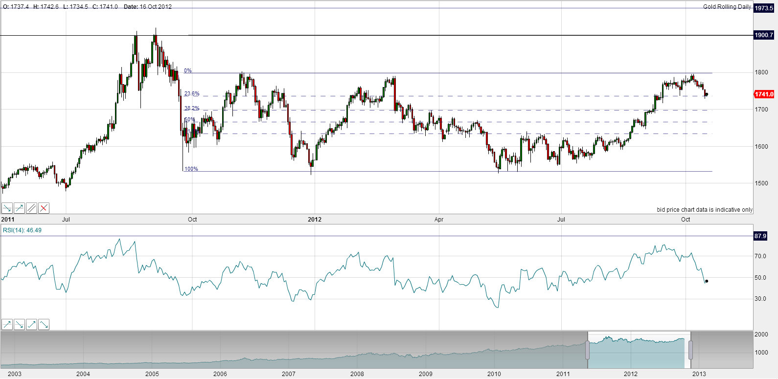 The Hang Seng has held up relatively well during this last 2 weeks and has maintained its long term triangle breakout. Treasury yields have also performed bullishly. Gold sentiment has pulled back sufficiently to enable a renewed move higher, and the 1700 level that it has currently reached represents a 38 fib retracement of the recent up move.