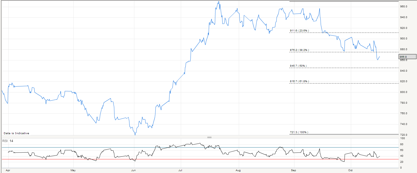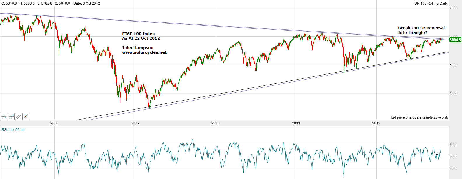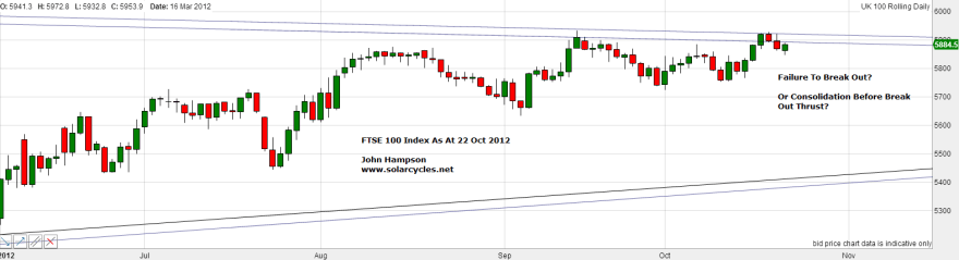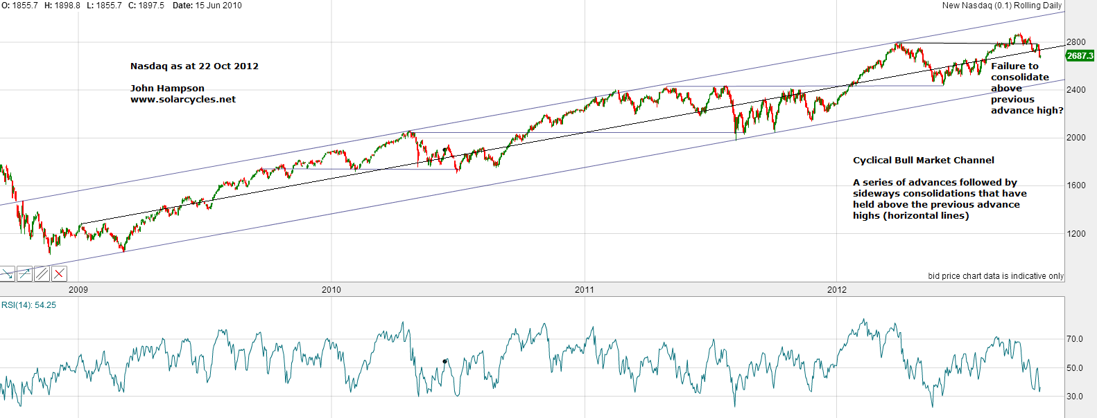 After this coming Monday’s full moon the pressure should change to positive, coinciding with positive seasonality into and around the US election. Again, as per my last post, I will be looking for an up move with negative divergences (in economic data and technicals) for evidence a cyclical equities topping has begun (and to sell into the up move), or for positive developments to accompany the up move and to suggest that the sell-off we have seen was rather a post QE announcement normal pullback based on unimpressive earnings. Tom Demark believes the Nasdaq has made its price peak already and the counter rally due will therefore fall short, whereas he believes the SP500 will make a marginal new high, before both then retreat 12-17%.