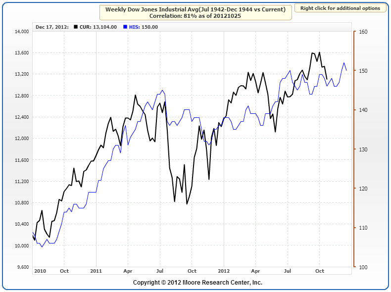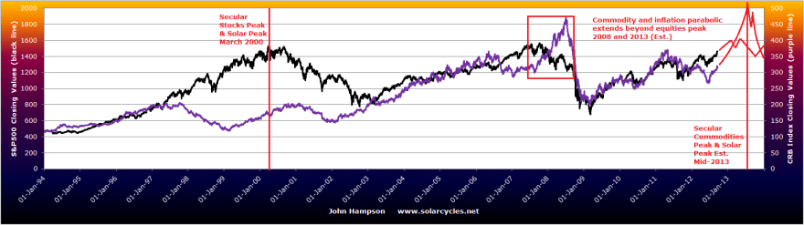 Both have chart correlation percentages over 80%, both 1944 and 1972 were US election years and both fell within secular stocks bear / secular commodities bull periods, and the combined prediction would be for an up move next into and around the US elections, which is consistent with expectations further up the page. No guarantees of course – just a guide.