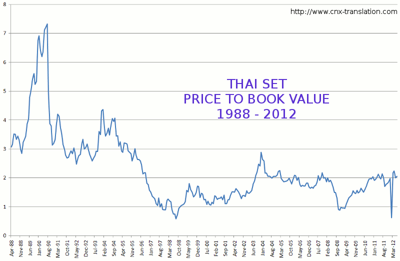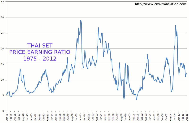 Here is the Thai SET long term p/e valuation chart, showing a double dip to around 3 in that crisis period. The Thai SET is currently 4 times higher now than then, so buying Thai stocks when the p/e was 3 would have been a good investment.
