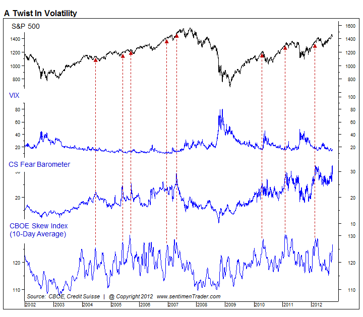 However, there are some warning flags for equities. This chart shows that when the Fear and Skew indices spiked together with a low Vix, equities were approaching a top.