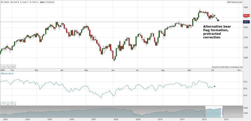 It marks the March/April 2012 highs, and the battle below and above that level in August and September is clear to see. Having broken out above it in September, the market is now retesting the breakout and yesterday, marked by the arrow, saw the index briefly break down beneath it only to rally strongly into the close and hold above it. I believe that may be significant, and today’s out of hours action (Europe morning) is so far bullish. But, there remains the possibility that we are making a bear flag in a protracted correction, and the SP500 (below) and Dow are higher above the March/April peaks with more room to consolidate downwards.