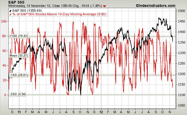 11. We are starting to see some signs that the equity market is becoming oversold from the short term perspective. One of my favourite charts shows that we are approaching internal breadth capitulation in the near term, especially thanks to Wednesdays strong selling pressure being a 90% down day. The basic 10 Day Advance Decline Line is also signalling oversold levels.