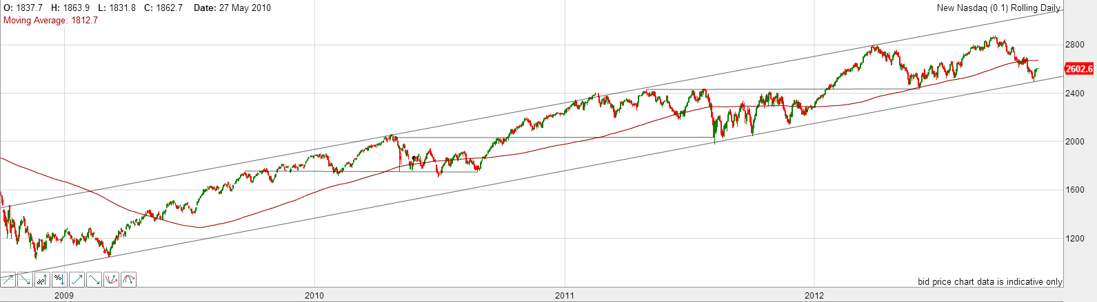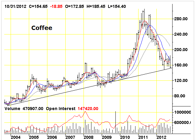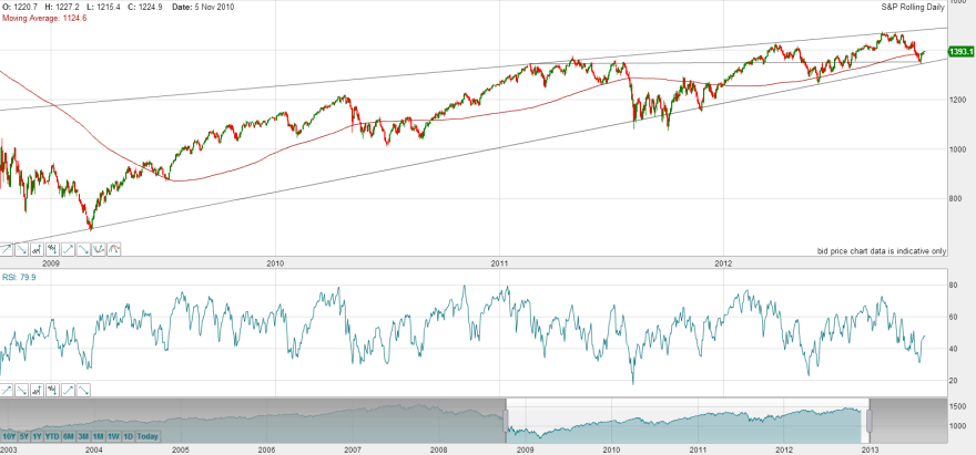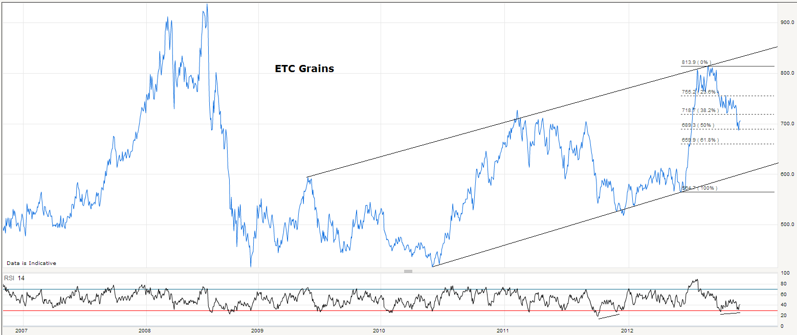 The following chart is an ETF for grains, which were the best performing commodities of mid-2012, due to adverse weather conditions. They have now made a 50% retrace of that upmove and on positive RSI divergence. By Gann, commodities should begin a large upmove as of now, so this could be a suitable point at which to resume an uptrend.