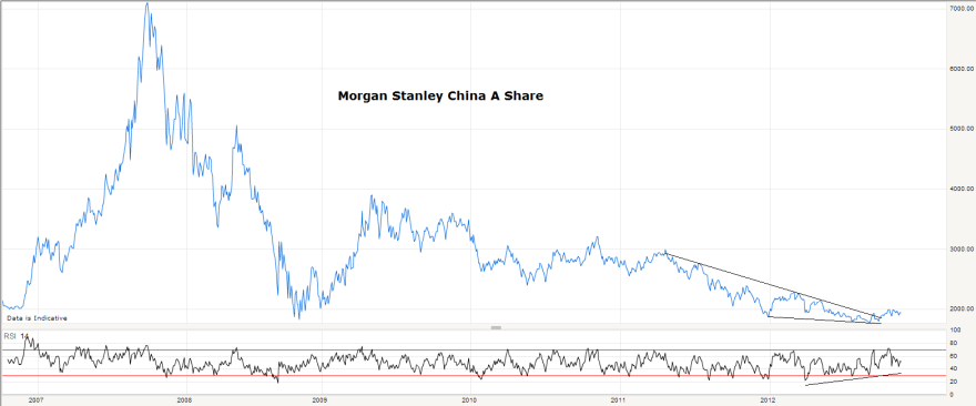 The Morgan Stanley China A shares ETF shows a tentative breakout from a declining wedge on positive RSI divergence.