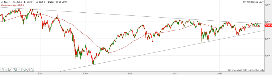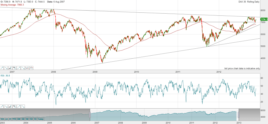 The German Dax remains technically bullish. Various supports and resistances are shown, with the Dax flirting with breakout of the longer term resistance also.