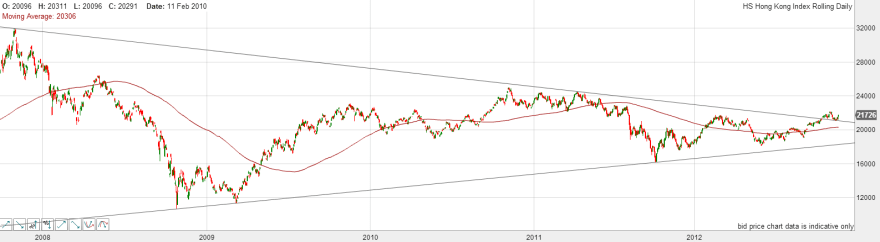 Looking wider, I noted a few days ago that the Hang Seng was backtesting the breakout of its long term triangle, and it has since advanced again, suggesting a successful backtest. It’s still tentative at this stage, but looks promising.